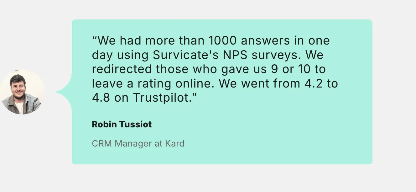 One practical example comes from Kard. Robin Tussiot, CRM Manager, used Survicate’s NPS surveys to ask customers for a rating. Those who scored the company a 9 or 10 were invited to share their review online.