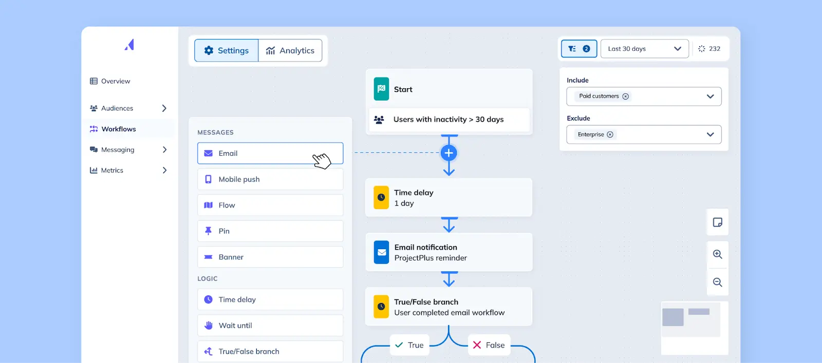 Userpilot’s key differentiator is real-time behavioral triggers. Flows and messages can react to what a user is doing, or not doing – for example when they get stuck on a screen, skip a critical action, or fail to discover an important feature. This makes it possible to remove friction exactly when it appears, speed up time-to-value, and increase the chances of successful activation. Built-in analytics, including funnel and path analysis, help identify drop-offs and measure whether changes actually improve adoption.