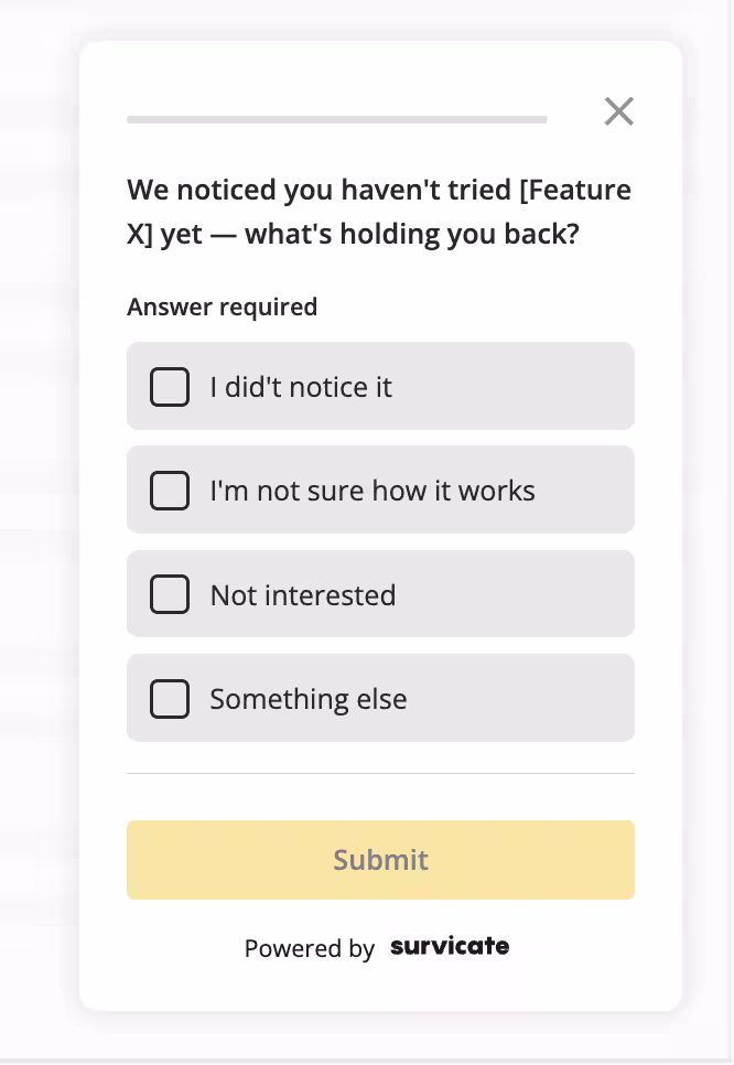 Step 3: A single, targeted question works best here: "We noticed [Feature X] hasn't been tried yet – what’s holding things back?" Including multiple-choice options like "I didn't notice it," "I'm not sure how it works," "It doesn't seem relevant," or "I meant to but forgot" makes it effortless for someone to respond. Adding an open-ended "Other" option is also a great way to catch any unique friction that hasn't been considered.