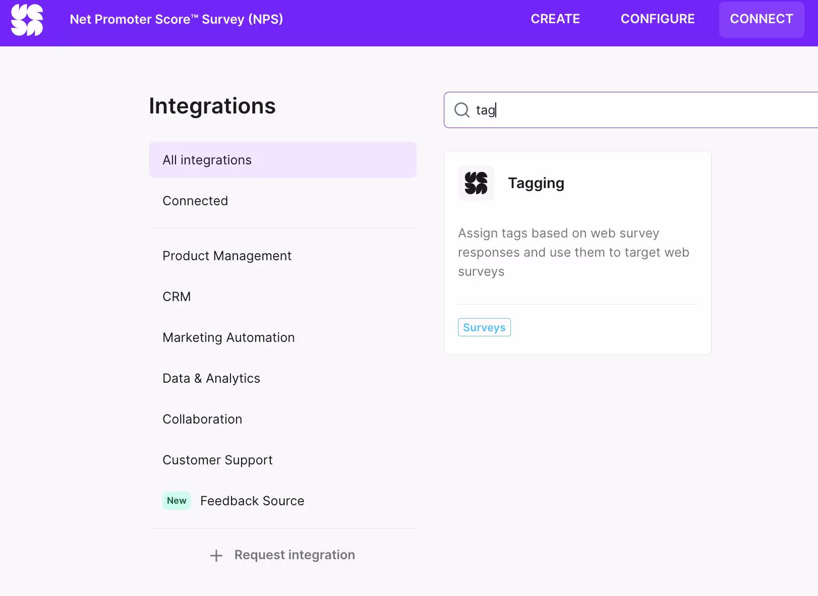 Step 5: Head back to your first NPS survey. To target passive users, specifically, you must enable “Tagging”. Go to Integrations, select All integrations, and in search type in Tagging. Click on it, and choose Connect.