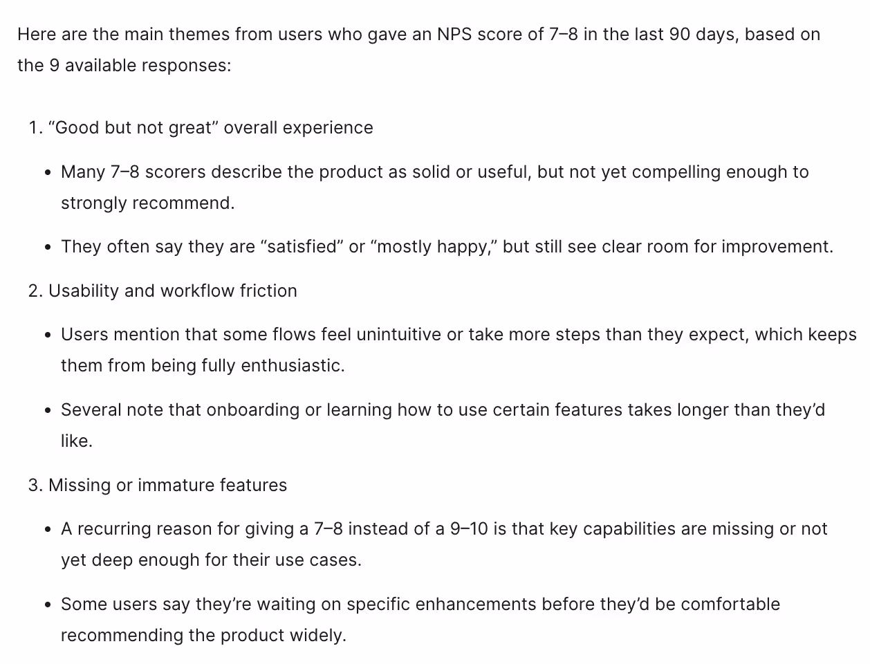 Step 1: Ask the Research Assistant to summarize the top themes from users who gave a score of 7-8 during a specific time range. It’s a huge timesaver because it sifts through all those open-ended responses and serves up a neat summary of what's on the minds of those passive users.