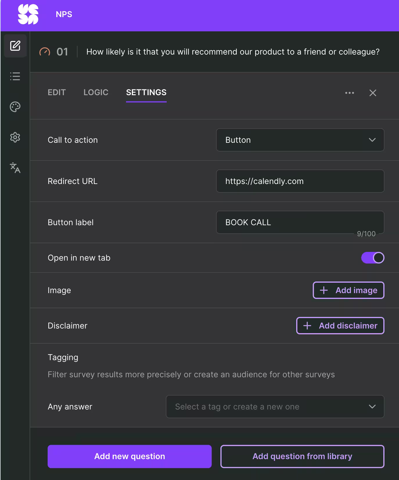 Step 6: Select the Settings for your NPS survey. You should now have the possibility to tag your Promoters, Passives, and Detractors.