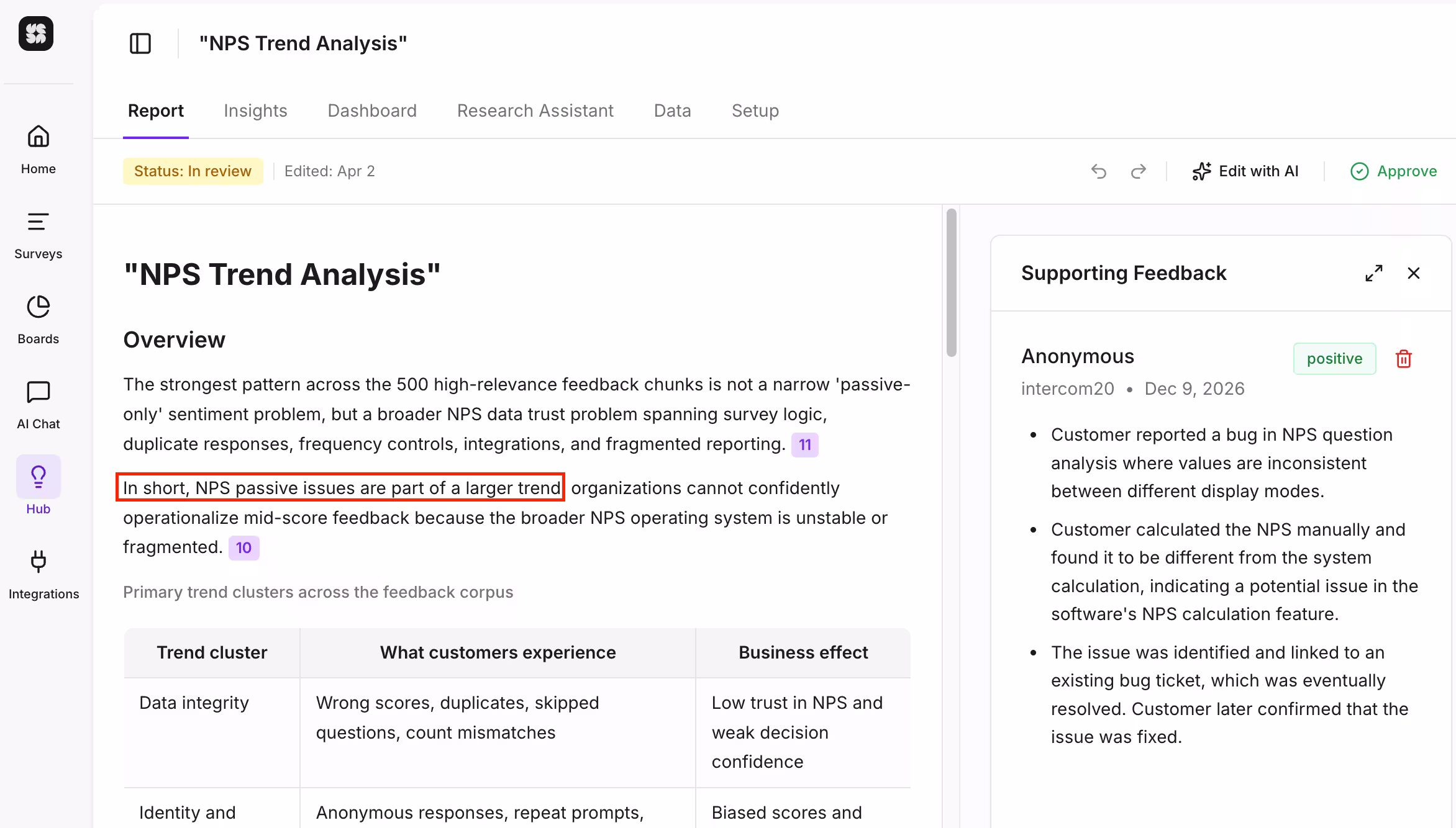 Step 2: Compare these themes with the themes you're seeing across multiple sources. You can ask the Research Assistant if this is consistent with what we're seeing across support tickets, customer interviews, and other feedback sources.