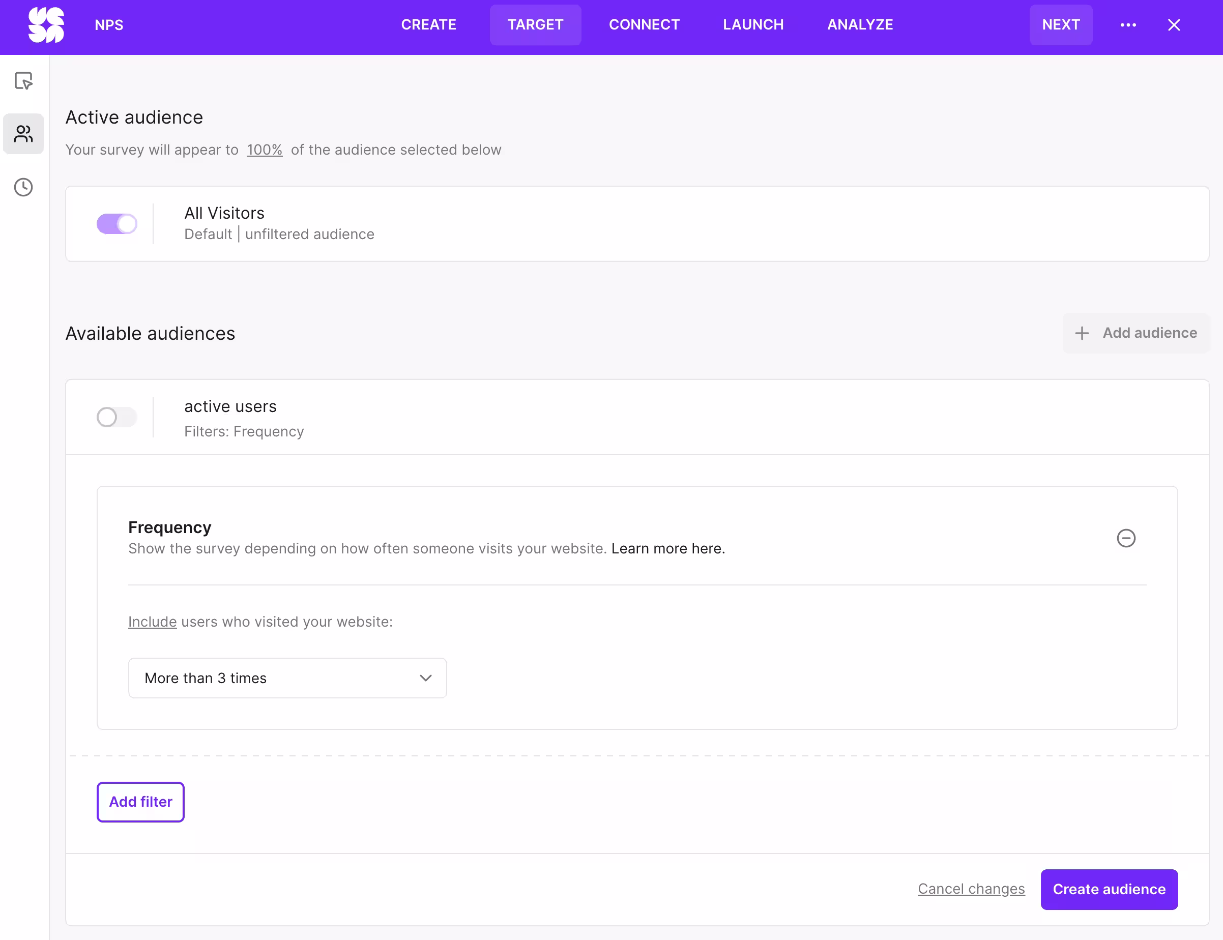Step 5: To gather the most relevant feedback, it’s best to focus on users who have actually spent some time using your product. Start by creating an audience and selecting the frequency attribute under Visit properties. Set the frequency to more than 3 times to ensure these users are regular visitors. Once that audience is saved, head to the left-hand bar and select the clock icon to set the timing.