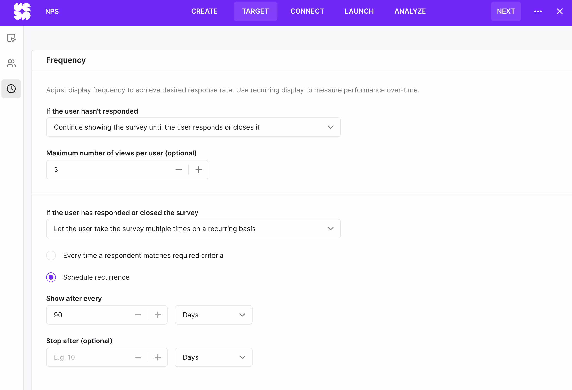 Step 6: Under "If the user has responded or closed the survey," select "Let the user take the survey multiple times..." and then "schedule recurrence." Setting the NPS to show every 90 days is a great way to avoid survey fatigue while still keeping the data fresh and relevant.