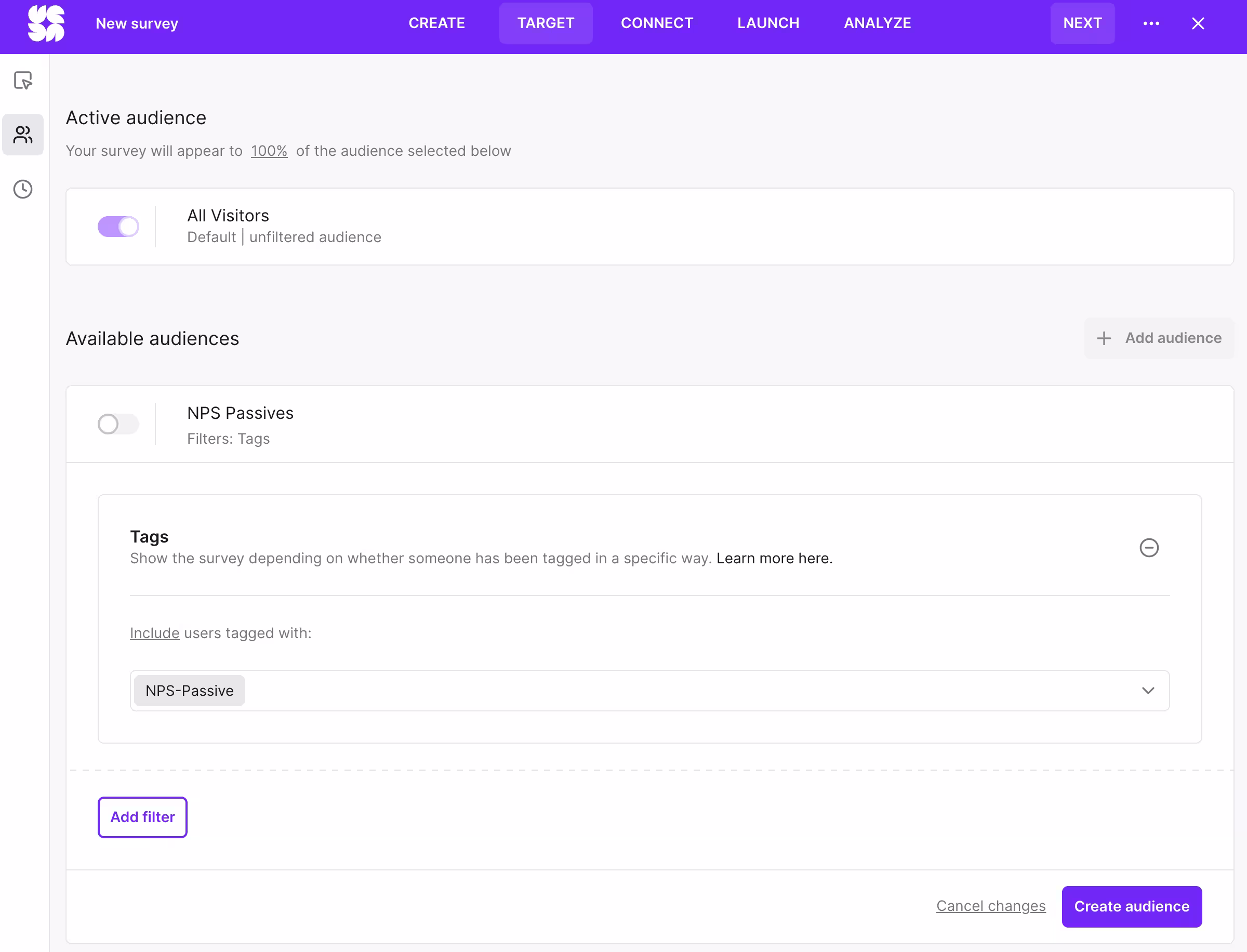 Step 7: Go back to your new in-product survey, select Target and Audience, and create a new audience based on your tag for NPS Passives. Important: Don’t forget to enable the audience after you’ve created it!
