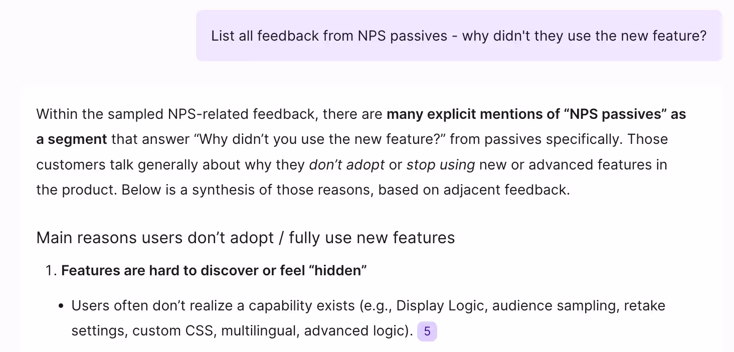 When a passive says "I like it, but the reporting could be more flexible," that sentence is precise and calm in a way that neither a promoter nor a detractor would produce. This makes passive-only responses the highest-quality raw material for research that informs real product decisions.
