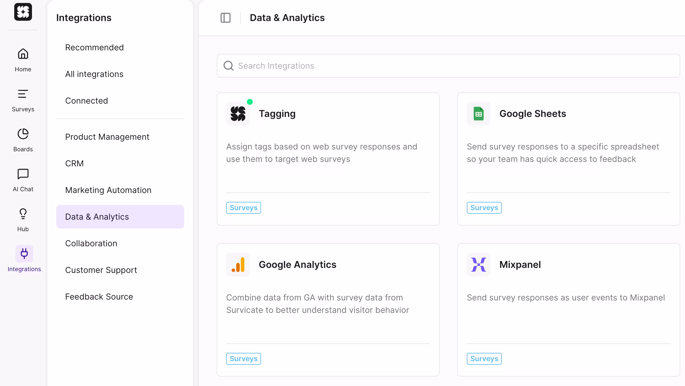 Step 1: To get everything talking, connect Survicate to the product analytics tool you use – like Amplitude or Mixpanel – using the native integration.