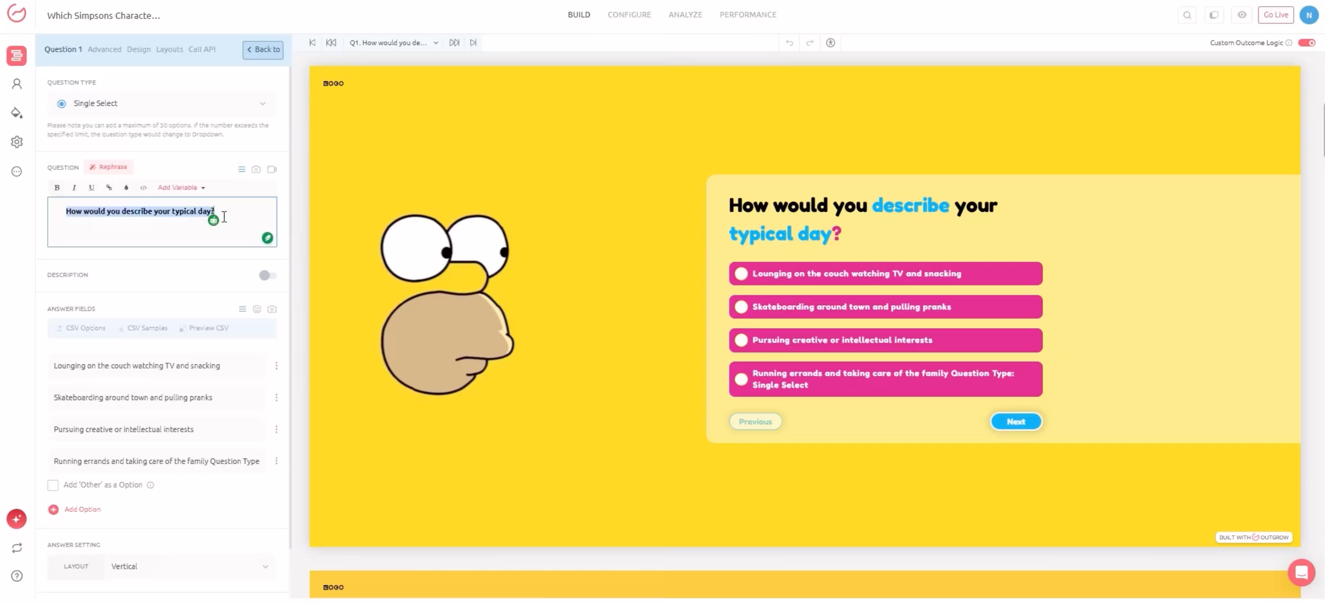 If you are looking for a tool to create complex or highly custom quizzes, Outgrow could be a better choice than Typeform. Customers highlight the customization features, which go beyond Typeform’s one layout.