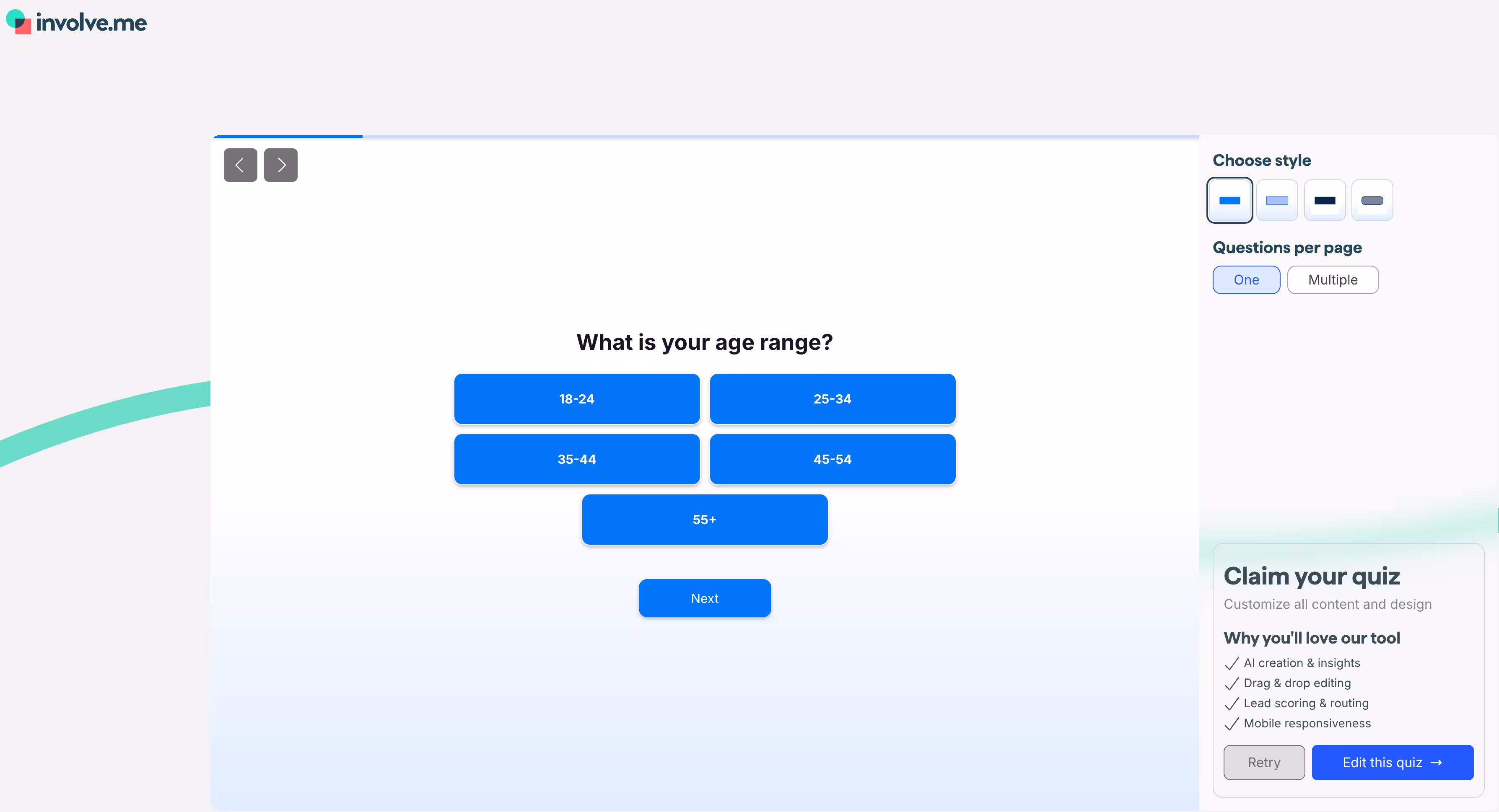 - One-question-at-a-time and smart logic gives you a Typeform-like, conversational flow that works well for quizzes